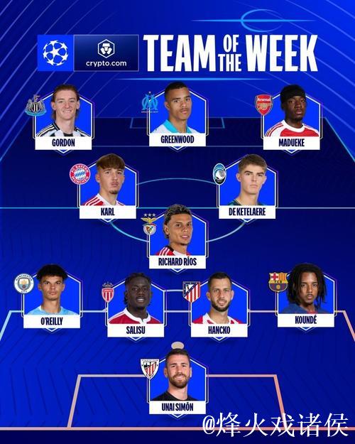 欧冠本周战罢,多场强强对话与青春风暴交织出新一轮话题焦点,欧足联官方也随之公布了本周最佳阵容。切尔西边锋马杜埃凯、巴萨多面手孔德以及拉齐奥前锋格林伍德三人领衔,占据了锋线与防线的核心位置,他们代表了本...